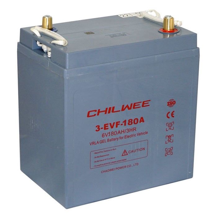 Тяговый аккумулятор Chilwee 3-EVF-180A (ёмкость 200 Ач (по C5), напряжение 6 вольт) изготавливается с применением технологии GEL, электролит представляет собой желеобразную массу. Гелевые батареи имеют большую теплоотдачу, повышенную устойчивость к глубоким разрядам. Аккумулятор является полностью герметизированным и необслуживаемым. Он не требует долива воды в процессе эксплуатации (в сравнении с классическими тяговыми аккумуляторами по технологии WET) и дополнительных усилий со стороны пользователя.