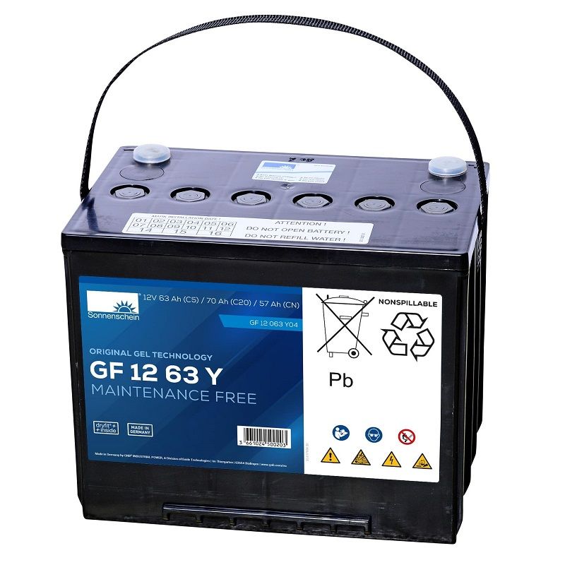 Sonnenschein GF 12 063 YO - тяговый аккумулятор ёмкость C5 63 Ач и напряжением 12 вольт разработан с применением технологии Dryfit (или GEL — электролит загущен до желеобразного состояния), что обеспечивает повышенную устойчивость к температурам и глубоким разрядам. Он применяется в электромоторах с высокими требованиями к энергоёмкости, циклической выносливости и мобильности: яхты, лодки, инвалидные коляски, уборочная и складская техника.
