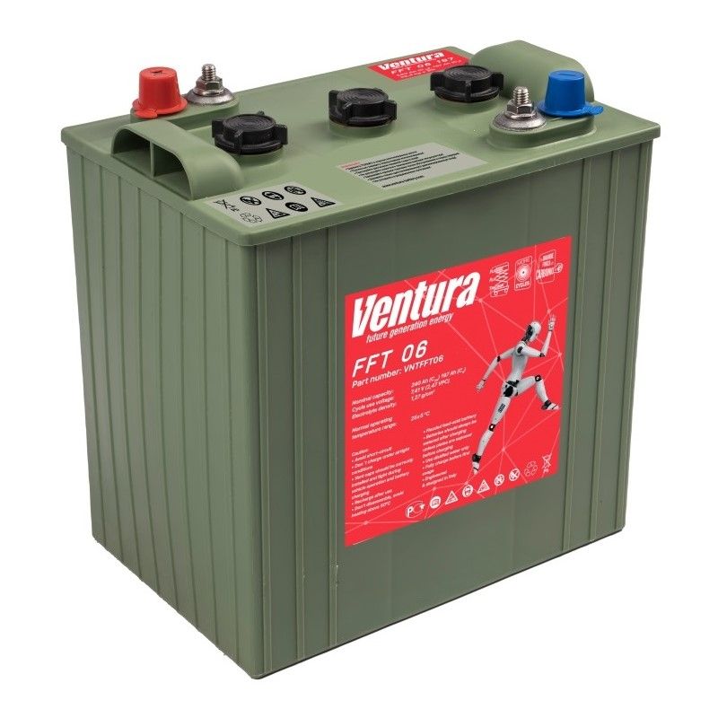 Ventura FFT 06 185 – тяговый моноблок с жидким электролитом и плосконамазными пластинами. Отличается ускоренным зарядом за счет низкого внутреннего сопротивления, быстрым выходом на номинальную емкость, а также весьма привлекательной стоимостью при солидном сроке службы не менее 1000 циклов заряд-разряд.
