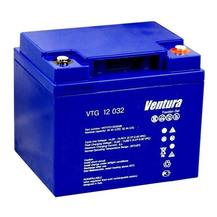 Ventura VTG 12 032 M6 – свинцово-кислотный тяговый аккумулятор напряжением 12В и ёмкостью 40Ач. Батареи адаптированы для циклического режима работы, однако при необходимости могут эксплуатироваться в режиме постоянной подзарядки. Производитель рекомендует Ventura VTG 12 032 купить для электрокаров, подъемной и складской техники, оборудования для уборки помещений, моторных лодок и катеров, других самоходных машин и механизмов на электротяге.