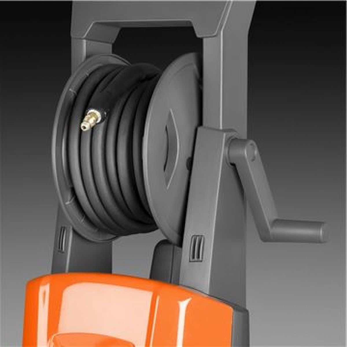 Пистолет – распылитель с шарнирными соединениями облегчает использование. Дистанционное управление настройки требуемого давления. Шланг с текстильной оплёткой, длинной 8 м, и катушкой для его хранения, форсунка «плоская струя», форсунка «ротор» и нерегулируемый пенный распылитель в комплекте.