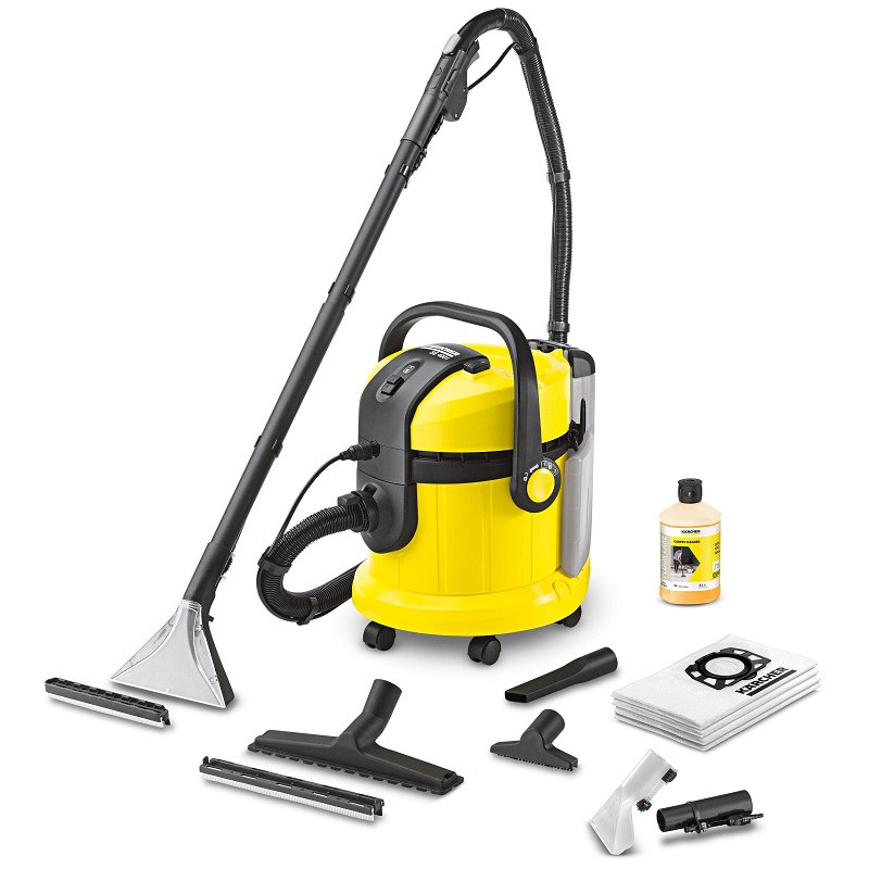 Моющий пылесос Karcher SE 4002, предназначенный для тщательной чистки текстильных и твердых напольных покрытий, работает по принципу распыления-экстракции и подходит как для сухой, так и для влажной уборки.