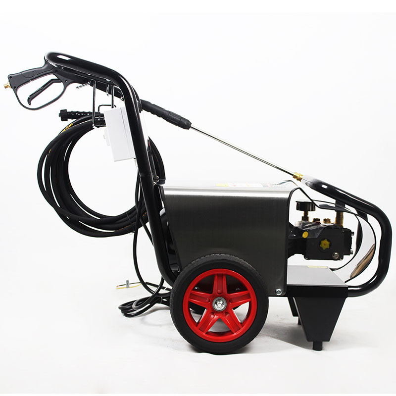 Мобильная конструкция на колесах с удобной ручкой позволяет легко перемещать мойку по объекту. Система управления включает функцию Total-Stop: при отпускании курка пистолета насос переходит в режим байпас, а электродвигатель автоматически отключается. В комплект поставки входят шланг высокого давления, пистолет, изогнутое копье, фильтр тонкой очистки и набор форсунок.