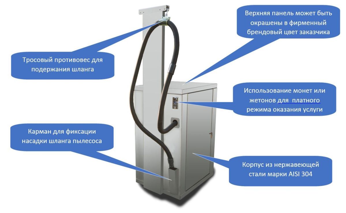 Мы обеспечиваем полный цикл разработки, сборки и доставки Пылесосов Самообслуживания Автомобилей. Корпус из полированной нержавеющей стали AISI 304 толщиной 1.5 мм., встроенные урна и балансир для поддержки двух шлангов, прием в качестве оплаты монет или жетонов, бесплатный и платный режим работы, комплектация 2х или 3х турбинными пылесосами. Круглогодичная эксплуатация под открытым небом при температуре от -30 до +45 С.