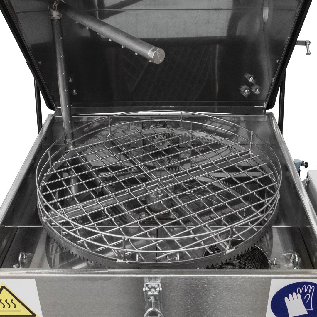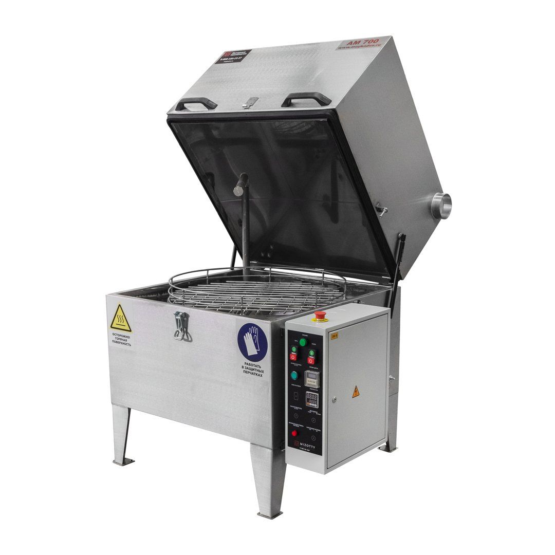 Серия AM700 AK комплектуется насосом мощностью 0,75 кВт, нагревательным элементом мощностью 3,15 кВт, баком из нержавеющей стали AISI 430 толщиной 2 мм и объёмом 120 литров, корзиной грузоподъёмностью 120 кг, электромеханическим приводом корзины с частотой вращения 5-10 об/мин., обеспечивающим высокое качество очистки, за счет равномерной подачи моющего раствора по всей поверхности деталей, цифровой системой контроля температуры, цифровым реле времени и системой аварийного останова.