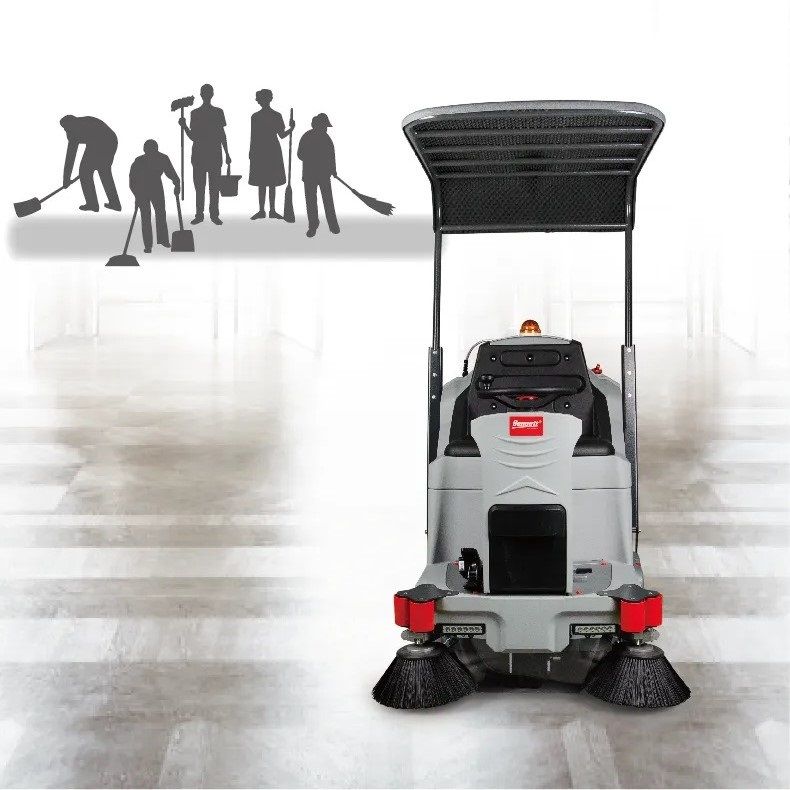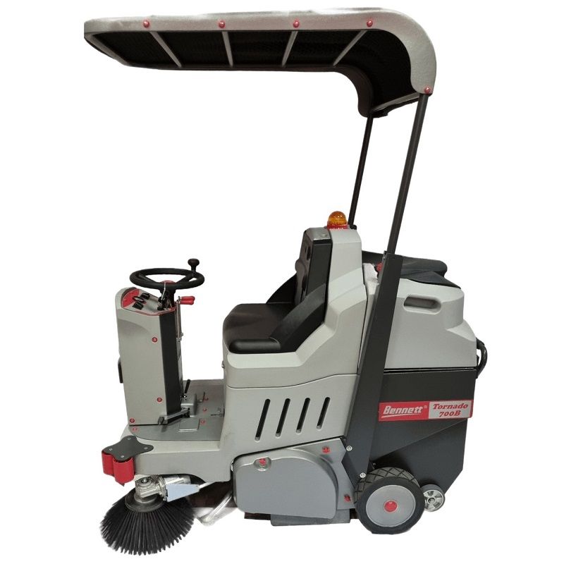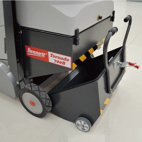 Bennett Tornado 700BD - аккумуляторная подметальная машина, предназначена для сухой уборки больших помещений открытого и закрытого типа, а также дворовых территорий. Работает от необслуживаемых гелевых АКБ. Рабочий блок оснащён двумя дисковыми щётками, которые собирают скопившийся на поверхности мусор и подают его к месту всасывания в контейнер. Рабочее место оператора оснащено комфортным креслом и эргономичной панелью управления. При необходимости можно установить тент для защиты от солнца или непогоды. Ширина обрабатываемой площади составляет 1200 мм. Продуманная система привода на переднее колесо позволяет маневрировать в самых неудобных и труднодоступных местах.