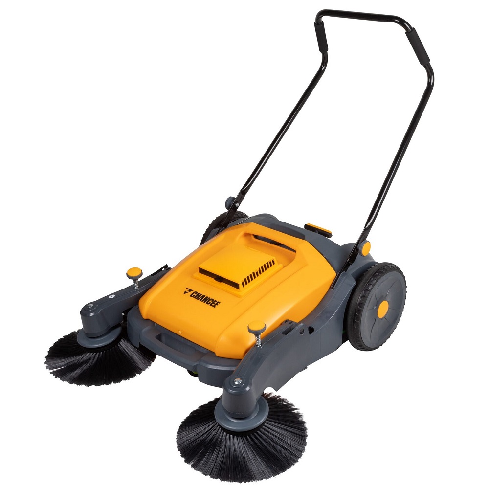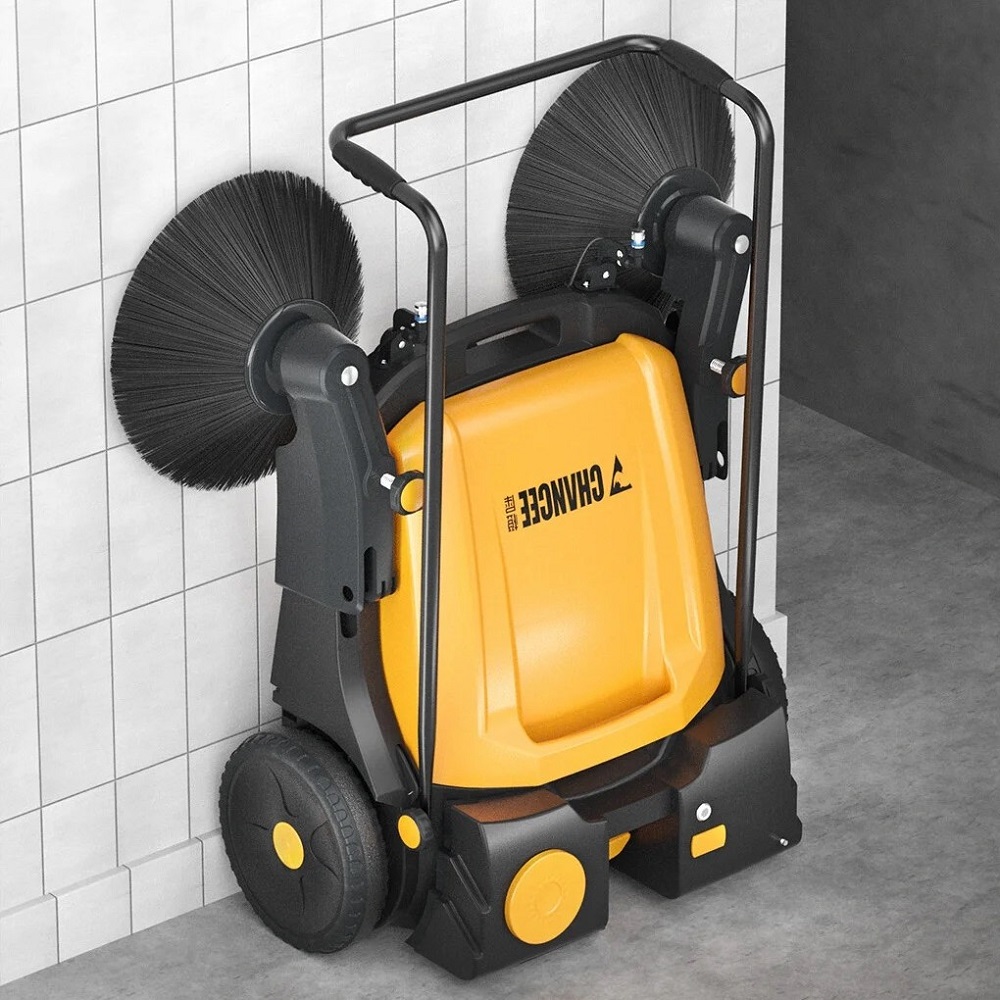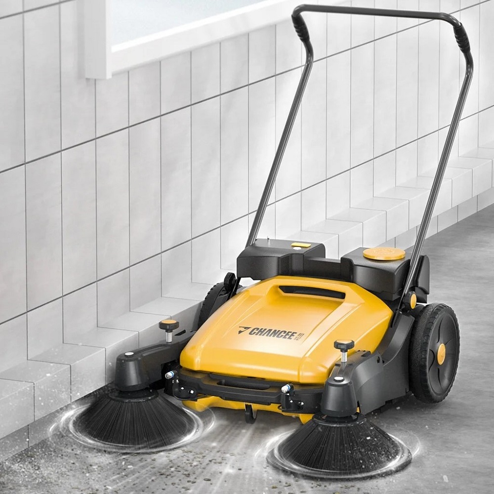 Ручная подметальная машина Chancee U90 Skylight с одной центральной и двумя боковыми щетками, не требует электроэнергии. Высоту щеток можно регулировать в зависимости от типа пола и количества мусора, чтобы машина могла добиться наилучших результатов уборки при минимальных затратах. Ручка имеет гибкую и складную конструкцию, подходящую для разных пользователей, а также облегчают хранение и транспортировку. Мусорный бак строго герметичен, легко устанавливается или снимается и устойчив к коррозии.