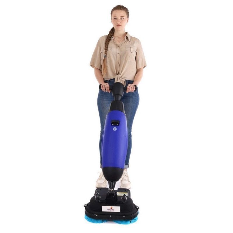 Модель обладает вертикальной формой, что облегчает процесс ее очистки и требует совсем немного места для ее хранения. Давление прижима этого агрегата превосходит обычную швабру в 8-10 раз, что позволяет добиться высокого эффекта от мойки пола. Широкая рабочая щетка позволяет за один проезд убрать большую площадь, она идеально подходит как для чистки небольших частных домов, так и для производственных помещений, ее можно использовать для чистки практически любой поверхности: линолеума, наливных полов, ПВХ-покрытий, искусственного или натурального камня.