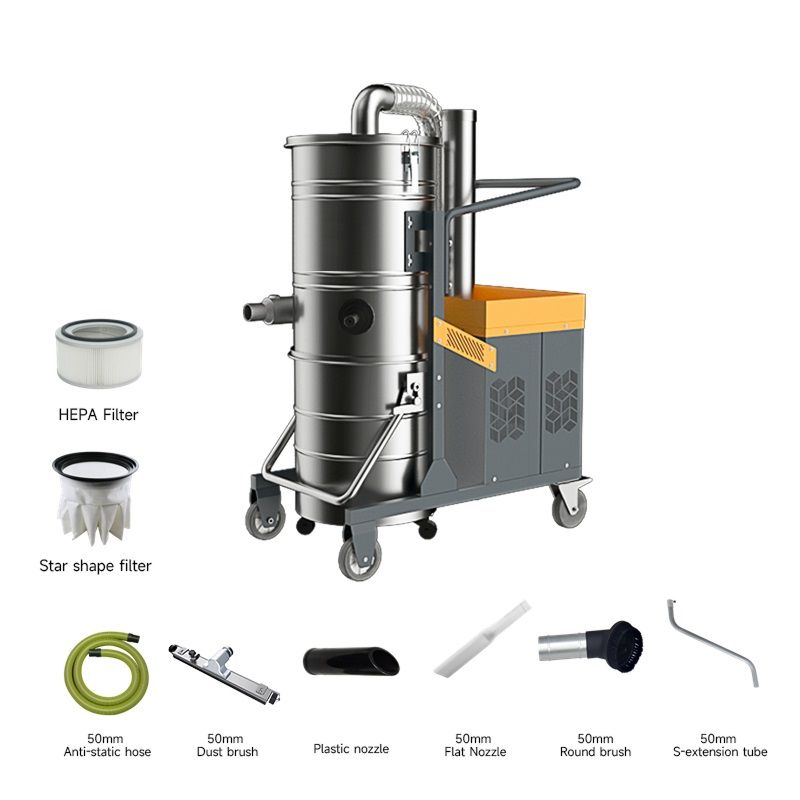 Корпус из нержавеющей стали выдерживает экстремальные условия эксплуатации и защищен от коррозии, а циклонная система предварительно отделяет крупные частицы пыли, продлевая срок службы фильтра. Объемный съемный контейнер на 100 литров упрощает удаление собранных отходов, а встроенный глушитель снижает уровень шума для комфортной работы персонала. Фильтрация нового поколения с полиэфирным фильтром площадью 32 000 см² обеспечивает чистый выходящий воздух, а ручная виброочистка фильтра избавляет от простоев при обслуживании.