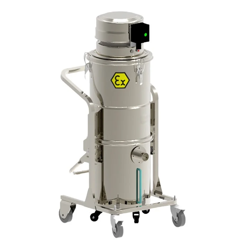 Пылесос сертифицирован по стандартам ATEX, CNEX и ТР ТС 012/2011, имеет герметичную электрическую систему с защитой IP65, заземление и антистатические элементы. Многоуровневая фильтрация включает антистатический фильтр-мешок и HEPA-фильтр с площадью фильтрации 20 000 см². Продуманное размещение всасывающего отверстия под фильтром минимизирует контакт грязи с фильтрующим элементом, что повышает эффективность и продлевает срок службы устройства.