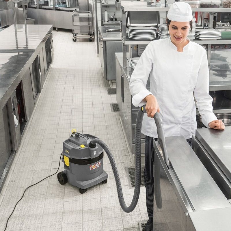 NT 22/1 Ap Te L впечатляет своими возможностями при решении задач связанных со сбором небольших и умеренных количеств разнообразного мусора: начиная от мелкой пыли, до мусора и жидкостей. Соединительное отверстие для всасывающего шланга расположено непосредственно на турбинной голове устройства что обеспечивает максимальную простоту утилизации собранного мусора. Благодаря полуавтоматической системе очистки фильтра и влагостойкому патронному фильтру из полиэфирного шелка PES, он может легко справляться с пылью, мелким мусором и жидкостью без особых усилий.