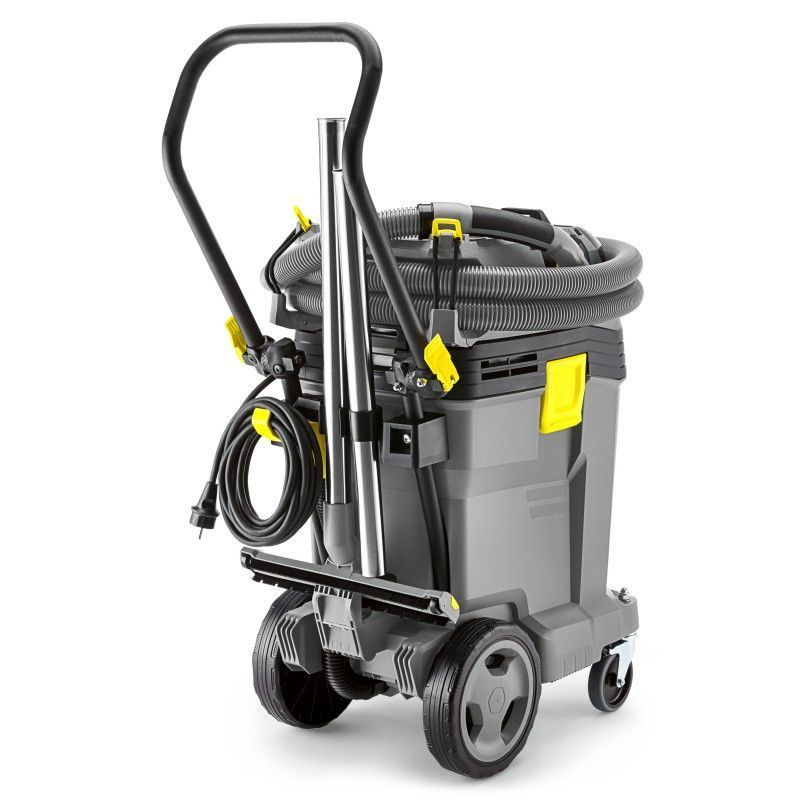 Karcher NT 50/1 Tact Te L - профессиональный пылесос для сбора мелкой пыли, крупного мусора и жидкости. 50-литровый контейнер с отбойником, металлическими колесами и маслостойким сливным шлангом также как и регулируемая по высоте рукоятка толкаемого типа делают данную модель идеальной для уборки мастерских, оборудования на производстве и использования на строительных площадках.